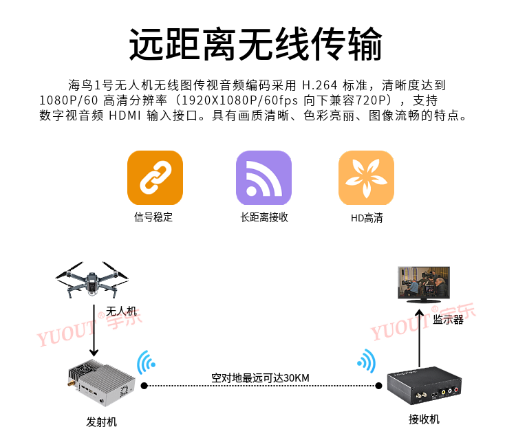 宇東海鳥1號無線圖傳高清微型無線視頻傳輸系統,采用Coded Orthogonal Frequency Division Multiplexing:編碼正交頻分復用調制技術,具有傳輸頻帶窄、很強的抗多徑干擾能力和抗多徑衰落能力,能夠實現非視距(NLOS),高速運動情況下實時傳輸高質量圖像。