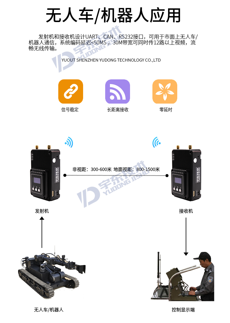 YDTD8000宇東視頻數(shù)據(jù)無線圖傳系統(tǒng)采用工業(yè)級無線高速率數(shù)據(jù)傳輸技術(shù),非視距,非WIFI,集合正交頻分復(fù)用時分多址調(diào)制及MIMO多進多出容量技術(shù),完全基于IP互聯(lián)網(wǎng)協(xié)議,實現(xiàn)全雙向透明通道傳輸。非視距:300-600米;地面視距:800-1500米;空對地:5000米。系統(tǒng)為純硬件連接,即插即用;創(chuàng)新性液晶一體化設(shè)計、豐富的CAN總線、RS-232、TTL電平接口,更好的用戶角度體驗。通道最大支持30Mbps吞吐量,可廣泛應(yīng)用于工業(yè)自動化、工業(yè)機器人、無人機、視頻監(jiān)控等通信工作。