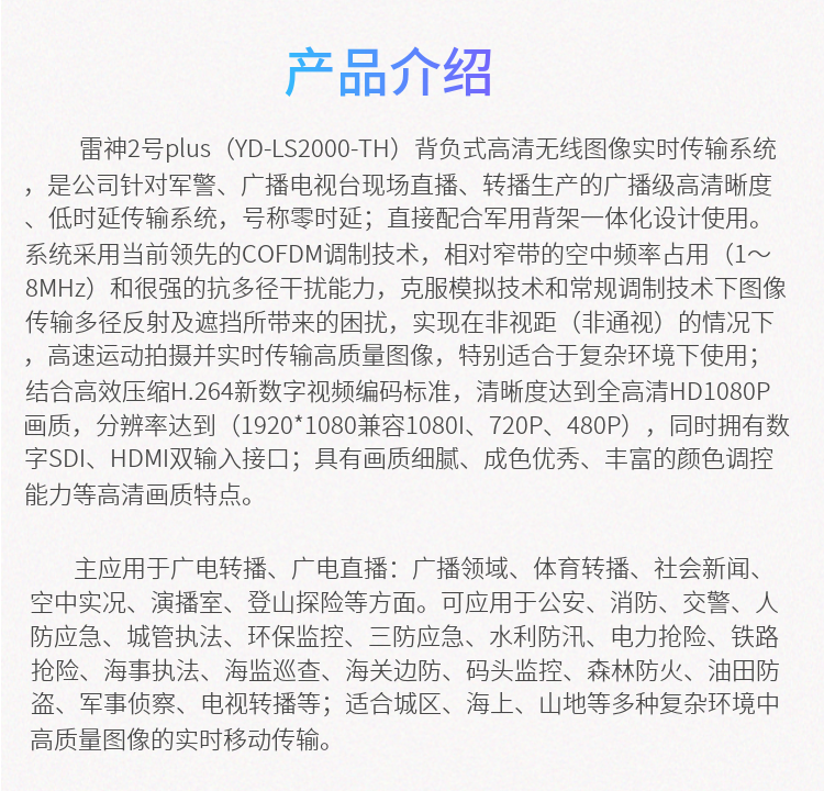 雷神2號plus(YD-LS2000-TH)背負(fù)式高清無線圖像實時傳輸系統(tǒng),是公司針對軍警、廣播電視臺現(xiàn)場直播、轉(zhuǎn)播生產(chǎn)的廣播級高清晰度、低時延傳輸系統(tǒng),號稱零時延;直接配合軍用背架一體化設(shè)計使用。系統(tǒng)采用當(dāng)前領(lǐng)先的COFDM調(diào)制技術(shù),相對窄帶的空中頻率占用(1~8MHz)和很強(qiáng)的抗多徑干擾能力,克服模擬技術(shù)和常規(guī)調(diào)制技術(shù)下圖像傳輸多徑反射及遮擋所帶來的困擾,實現(xiàn)在非視距(非通視)的情況下,高速運(yùn)動拍攝并實時傳輸高質(zhì)量圖像,特別適合于復(fù)雜環(huán)境下使用;結(jié)合高效壓縮H.264新數(shù)字視頻編碼標(biāo)準(zhǔn),清晰度達(dá)到全高清HD1080P畫質(zhì),分辨率達(dá)到(1920*1080兼容1080I、720P、480P),同時擁有數(shù)字SDI、HDMI雙輸入接口;具有畫質(zhì)細(xì)膩、成色優(yōu)秀、豐富的顏色調(diào)控能力等高清畫質(zhì)特點(diǎn)。