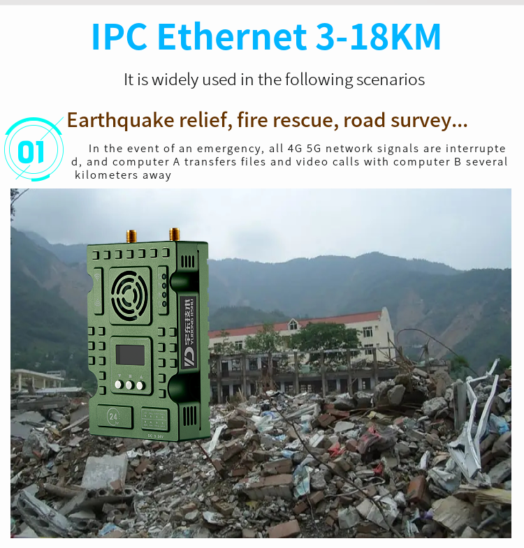 YD-TD9008-DT wireless broadband transmission radio adopts industrial-grade wireless high-speed data transmission technology, non-line-of-sight, non-wifi, set orthogonal frequency division multiplexing TDMA and MIMO multi-input and multiple-output capacity technology, completely based on IP Internet protocol, to achieve full bidirectional transparent channel broadband transmission. Non-visual distance: 300-900 meters; Ground visual distance: 2-18 km. The system is pure hardware connection, plug and play; Innovative LCD integrated design, rich CAN bus, RS-485, TTL level interface, better user perspective experience. The channel supports a maximum of 30Mbps of swallowing and spitting, and can be widely used in industrial automation, industrial robots, drones and other communication work.