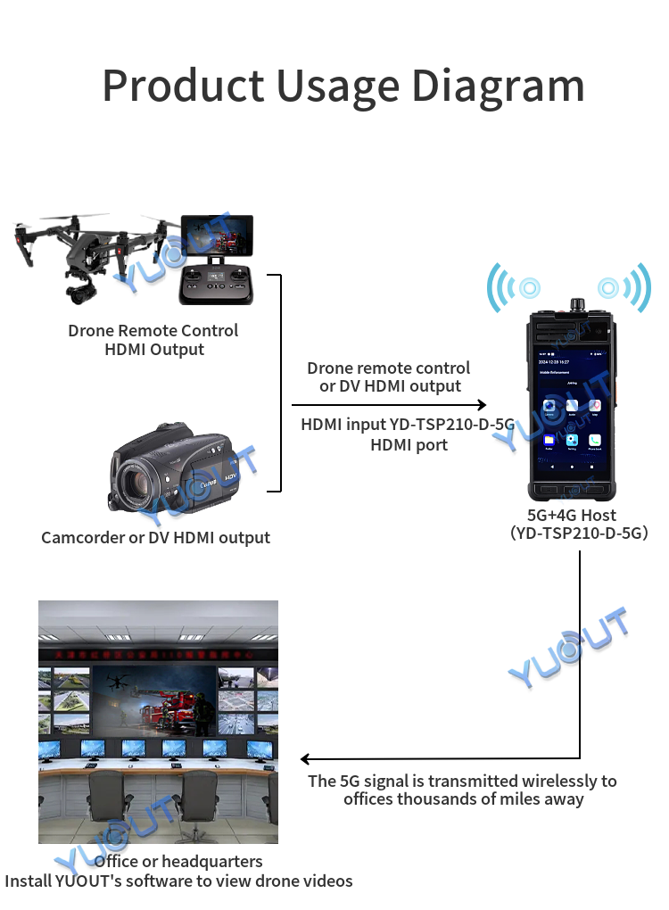 YUOUT YD-TSP210-D-5G is a multi-functional intelligent device with built-in front camera head and rear camera, and supports external HDMI signal source input. This device supports 5G+4G function, and can remotely view the live video of the staff in other regions or cities in the office/command center (for example, I am now in Shenzhen, China, and can view the re-scene video of the staff in Beijing, China), positioning information and call intercom. Install mobile SIM card, can also be used as a mobile phone, can make phone calls. The device is light, easy to carry, and can be hung on the chest and belt. Mainly used in public security patrol, traffic police, drone remote control HDMI output, DV camera and so on.