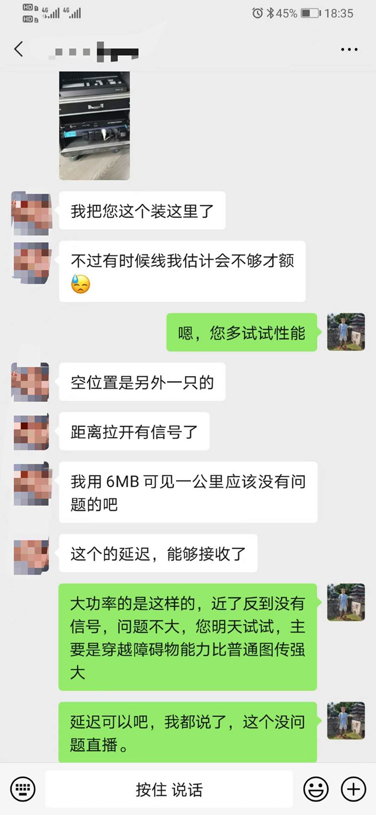 重慶李老師剛開如對我們的雷神2號無線圖傳有點不放心,經過實測后,距離遠超1KM,最重要的是,極低的延時,直播、游機、監看都很給力,馬上又購置了一套,感謝李老師的信任與支持,大功率的太近,沒有信號,要拉個2米以上,信號才出來,所有大功率產品都是這樣的,包括市面上的500米至800米無線圖傳。